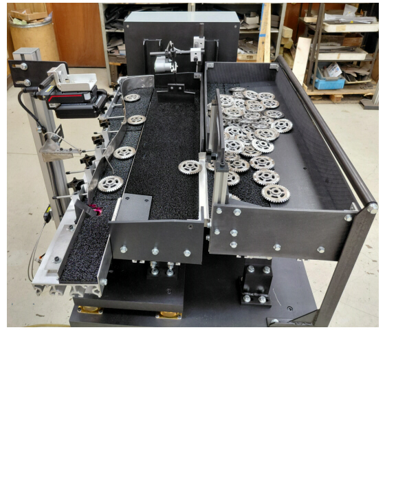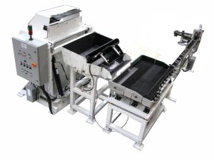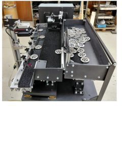 CDS LIPE Manufacturing designed and built this gentle handling Dyna-Slide linear vibratory parts feeder to feed and orient sprockets. Vision based sortation equipment is used to detect sprockets with the wrong side up. When a misoriented wrong side up part is detected the vision system, pneumatic tooling flips the sprocket over to a right side up orientation. Properly oriented sprockets are fed in a diameter to diameter specified end up orientation to the customer’s down line equipment.
