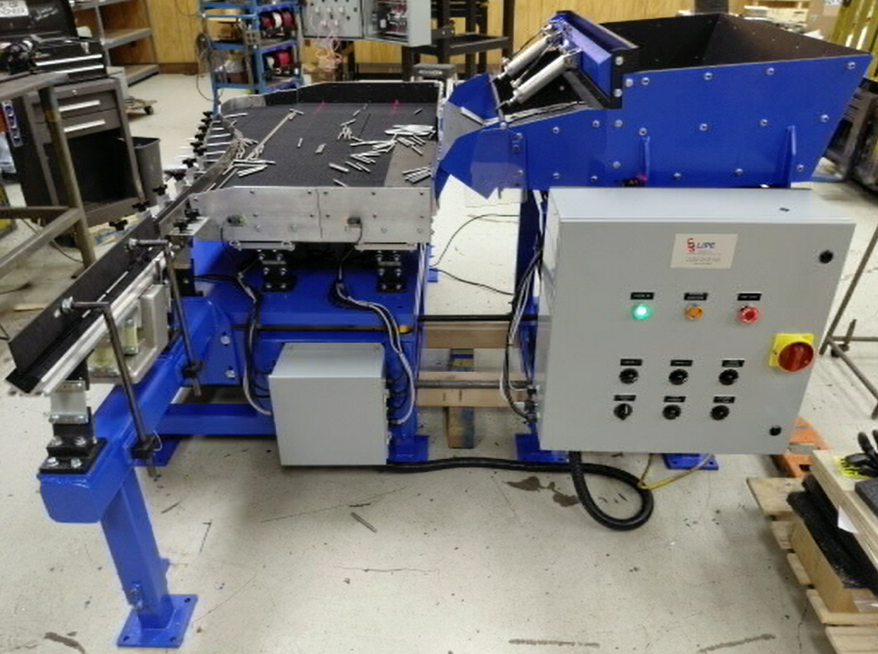 CDS LIPE Manufacturing designed and built this DYNA-SLIDE F1436 linear vibratory parts feeder to feed cylindrical rods of varying lengths and diameters to our customer’s centerless grinder. Adjustable fence and wiper tooling makes changing set ups between parts fast and simple. This automatic grinder feeder delivers parts in an end-to-end orientation to the customers grinder infeed equipment.