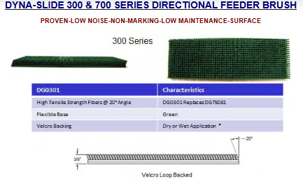 Dyna-Slide Directional Feeder Brush is ideal for moving parts, packages or materials quickly, gently and quietly. Its 20 degree fiber on a vibratory surface efficiently feeds, orients, accumulates, transports an extraordinary variety of parts packaged and materials Replaceable, long lasting brush is gentle on fragile parts and part surfaces. Typical Dyna-Slide Brushlon conveyor, feeder or accumulator operate at less than 65 dba. Available for both wet and dry applications. Also know as carpet conveyors and brush conveyors.